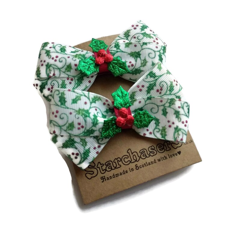 Christmas Hair Bobbles Pack Of 2 Holly Hair Bows On No Snag Elastic