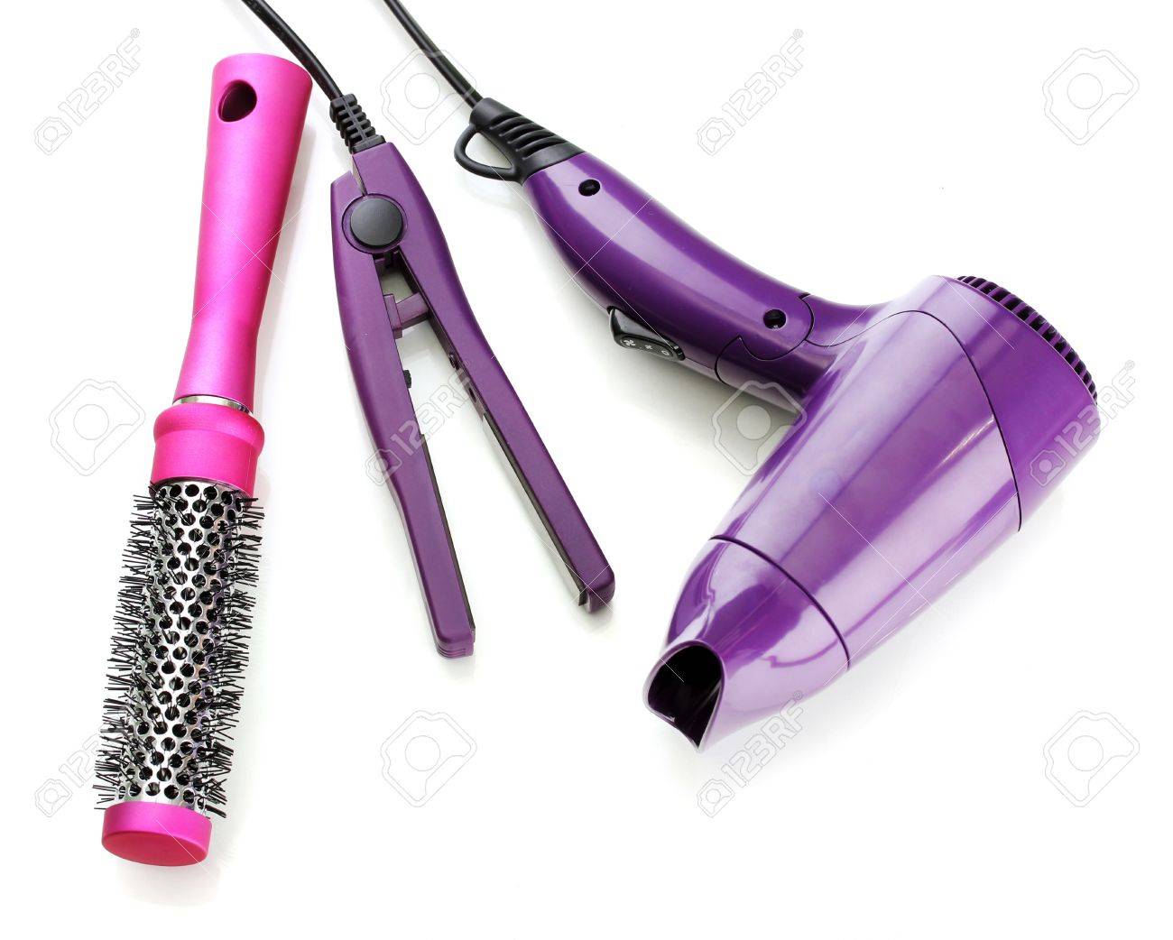 Hair Dryer Straighteners And Comb Brush Isolated On White