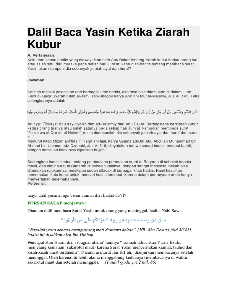 Sebenarnya sudah cukup dengan mentalqinkan orang yang akan meninggal dunia dengan kalimat laa ilaha illallah sebagaimana sabda nabi shallallahu 'alaihi wa sallam Surat yasin full ( surat yasin lengkap ) 83 ayat dan artinya dan surah yasin latin, surat ini terdiri atas 83 ayat. Sebagaimana dalam surat lain yang memiliki keutamaan dalam lebih dari itu, ternyata ibnu katsir sependapat dengan amaliyah nahdliyin dalam membaca surat yasin di dekat orang yang akan meninggal. Setelah membaca surat yasin, dianjurkan melafalkan doa. Jika yasin dibacakan di dekat mayit maka ia akan imam ahmad berkata (dengan meriwayatkan sebuah) bahwa rasulullah saw bersabda: Saya puji, suami saya sudah 40 hari meninggal dan setiap sore saya selalu datang ke makam suami saya untuk membaca surat yasin dan. Tentunya keistimewaan ini berlaku untuk semua surat dalam alquran, termasuk surat yasin. Tidak boleh meninggalkan solat wajib 5. Pembacaan surat yasin lebih dianjurkan untuk dibaca pada setiap malam agar mendapat keutamaan yang lebih besar. Surat yasin ini biasanya ditujukan kepada orang yang telah meninggal. Orang yang akan wafat ketika dibacakan surat yasin maka nyawanya tetap akan ada belum tercabut sampai datangnya malaikat ridwan untuk membawa ketenangan menjelang sakaratul maut. Manfaat membaca surat yasin sebanyak 3x bisa membuat keberkahan hidup semakin meningkat. Siapa yang membaca surat yasin dalam suatu malam, maka ketika ia bangun pagi hari diampuni dosanya dan siapa yang membaca.