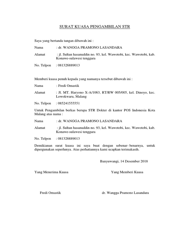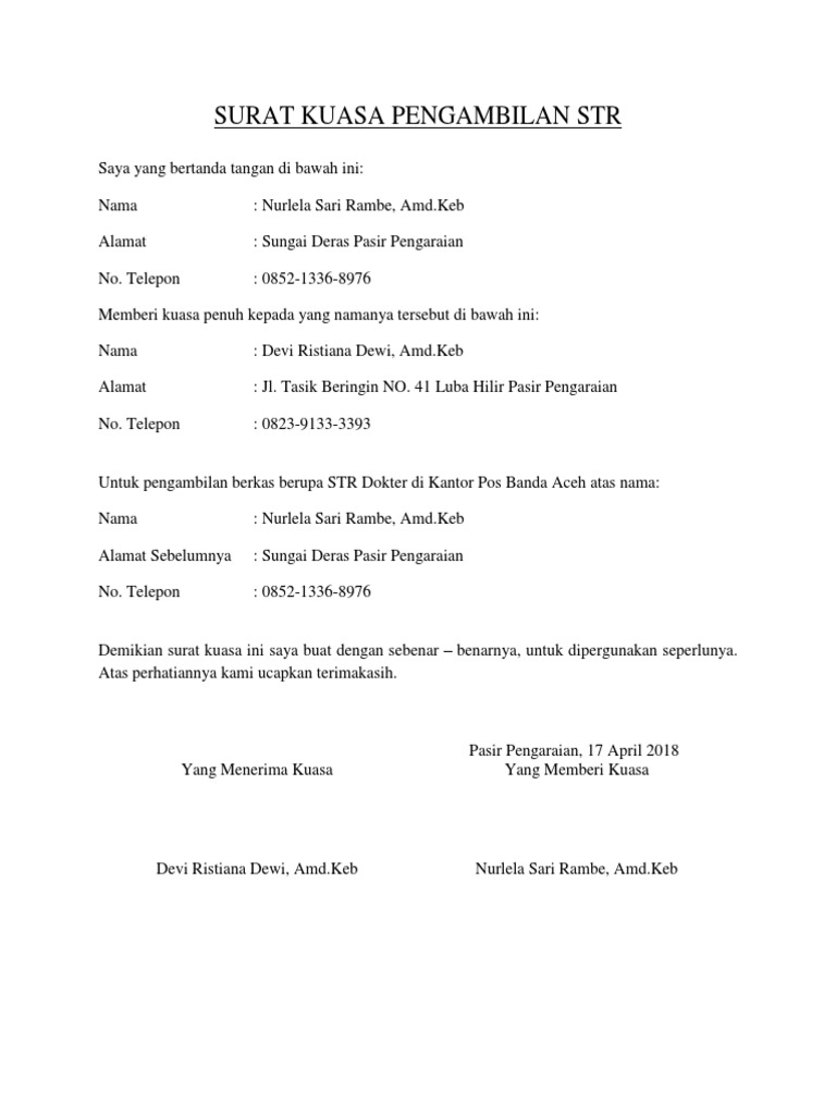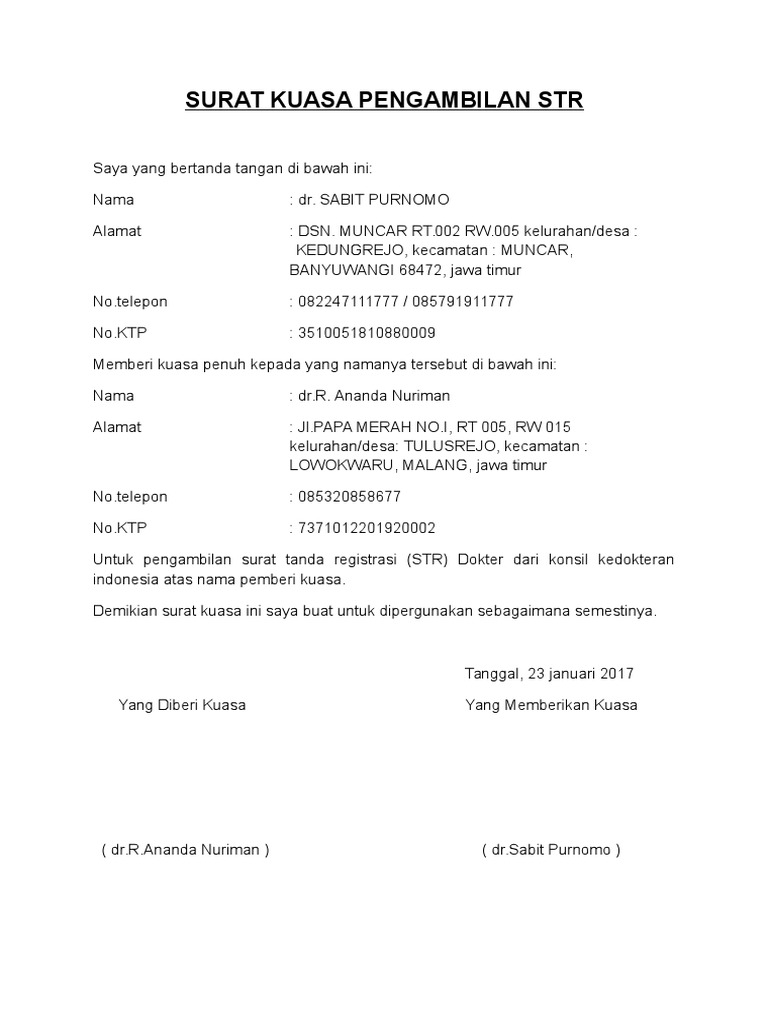 Contoh surat kuasa pengambilan dokumen str. Mungkin diantara kalian ada yang sering mengambil uang pribadi di bank namun anda sedang berhalangan. Demikian penjelasan mengenai contoh surat kuasa pengambilan str. Sebelum membuat surat kuasa, ada baiknya ketahui contoh surat kuasa yang baik dan benar terlebih dahulu. Untuk pengambilan surat tanda registrasi (str) dokter dari konsil kedokteran indonesia atas nama pemberi kuasa.