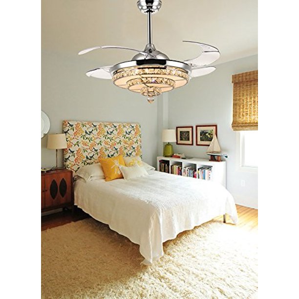 36 crystal ceiling fan with light, modern luxury chandelier fan with remote control retractable abs blades 3 speeds for living room dining room bedroom (chrome silver) automatic time setting: